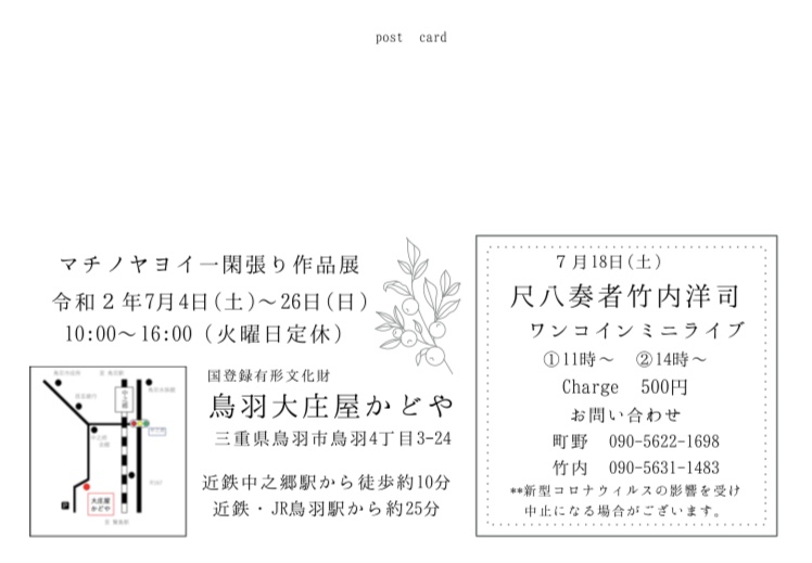 鳥羽市鳥羽4丁目3-24 鳥羽大庄屋かどや にて7月4日〜26日(日) 10:00〜16:00 (火曜日休館)マチノ在廊は木曜日、土曜日、日曜日です。